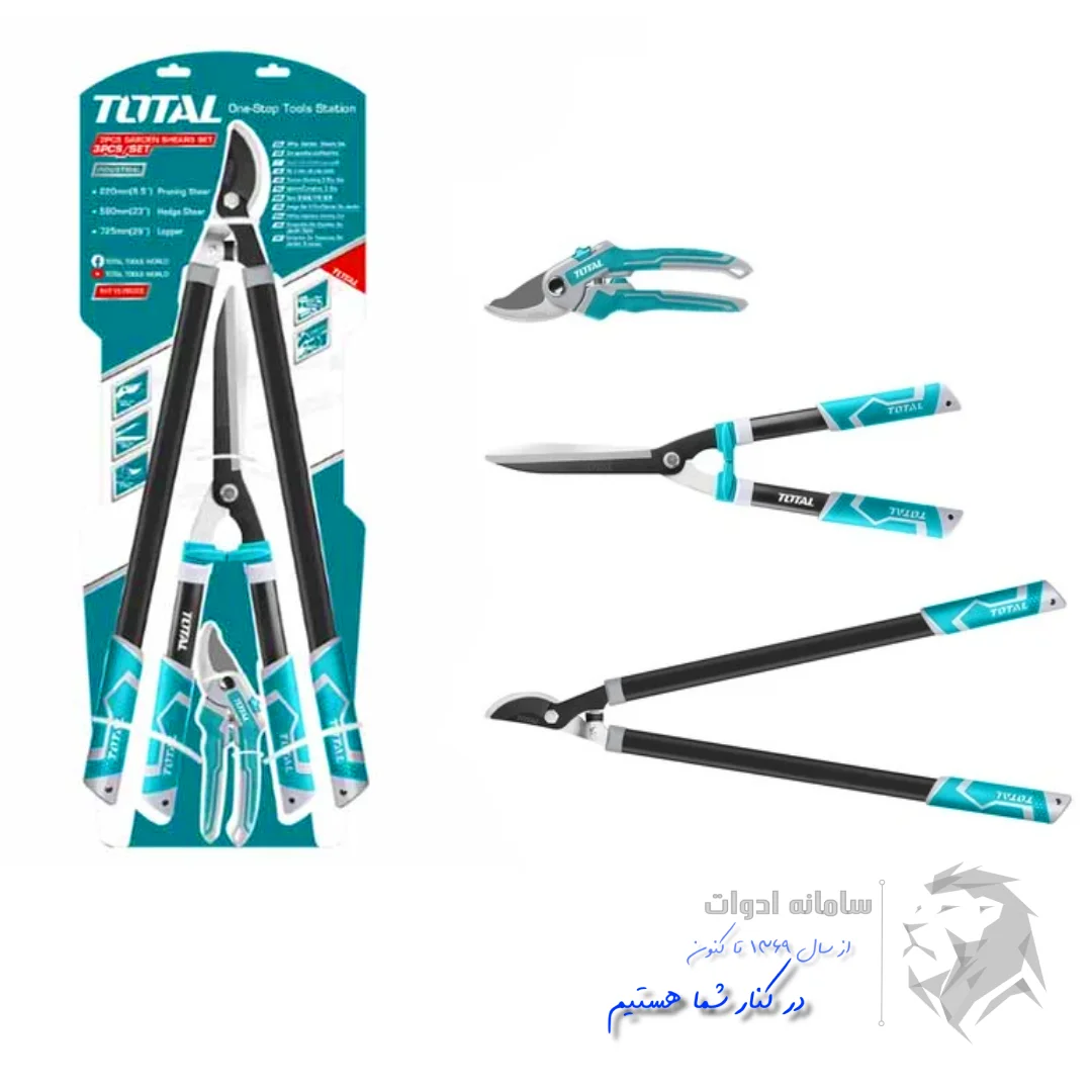 مجموعه سه عددی قیچی باغبانی توتال دارای قیچی شاخه زن مستحکم و با دوام به طول 73 سانتی متر | قیچی شمشاد زن 55 سانتی با قطر برش بالا | همراه قیچی باغبانی با قابلیت قفل تیغه | جزئیات بیشتر ⇐ توضیحات تکمیلی