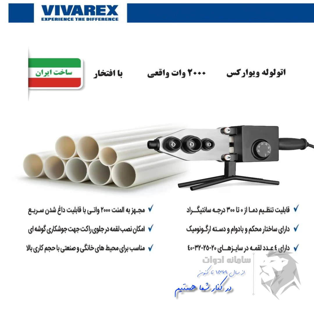 اتولوله کشی گوشه زن با لوازم ویوارکس همراه 4 سایز لقمه مصرفی : 20 ، 25 ، 32 و 40 | گارانتی 12 ماهه و المنت 2000 وات قدرتمند | کلید دو پل و ترموستات با کیفیت قابل تنظیم تا 300 درجه سانتی گراد | جزئیات بیشتر ⇐ توضیحات تکمیلی .